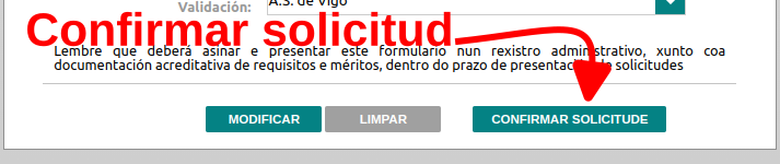Además, abajo del todo aparece una nueva opción que indica “Confirmar solicitude”. Pulsando en esta opción confirmas que los datos son los definitivos.