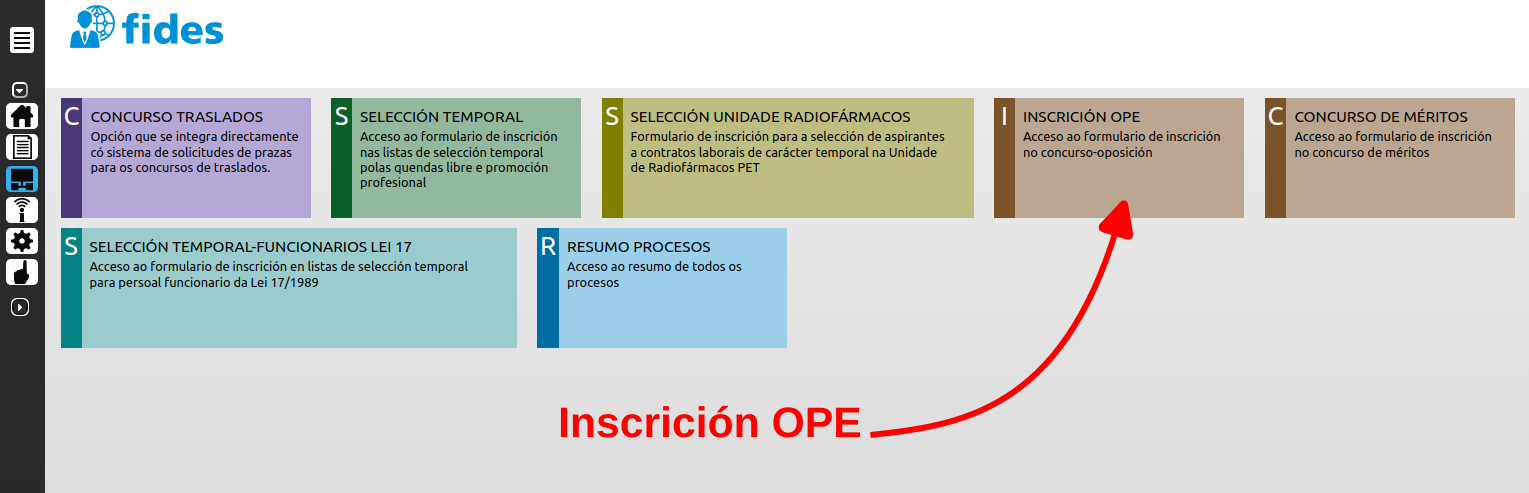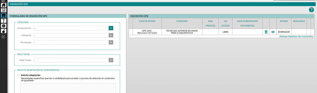 Después debes elegir “Inscrición OPE” entre las opciones disponibles. De este modo accederás al formulario para la inscripción en la oposición.