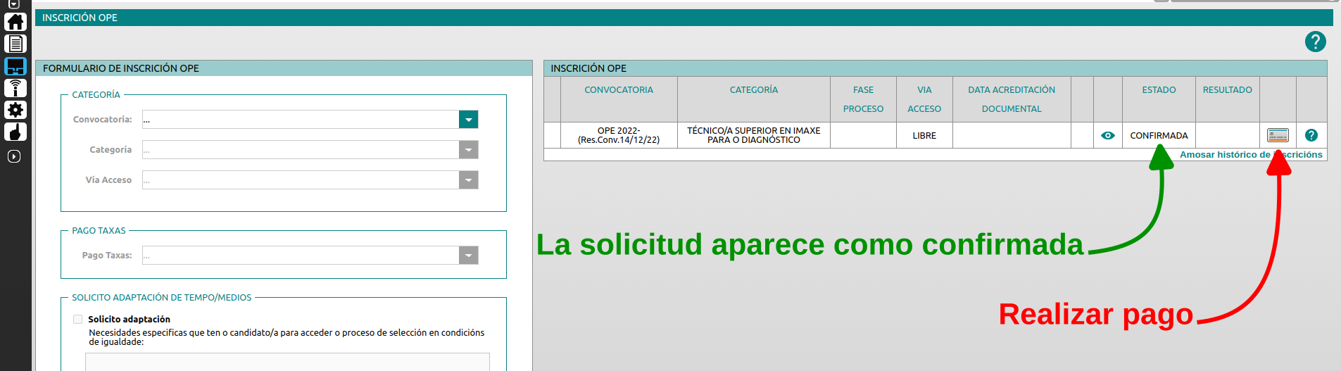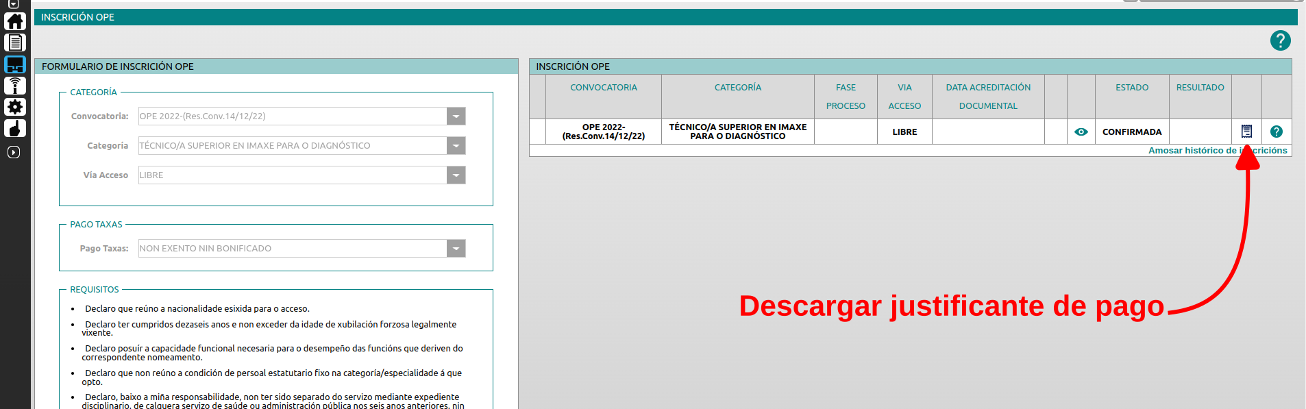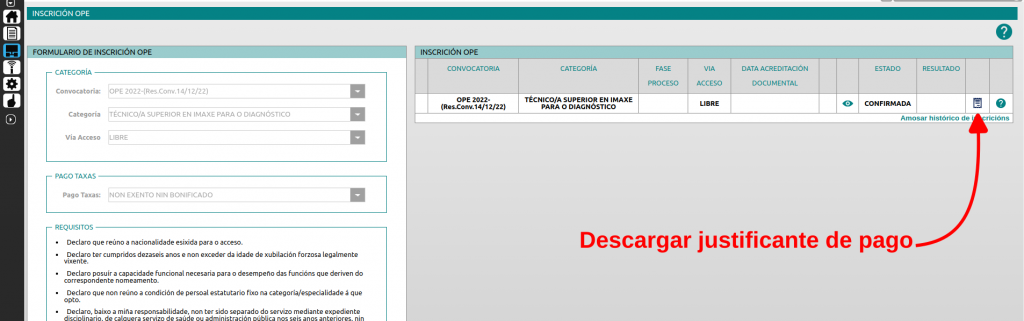 Si vuelves a la página de “Inscición OPE” (a través de FIDES > Procesos > Inscrición OPE) te aparecerá la solicitud como confirmada y tendrás una nueva opción para realizar el pago de las tasas.