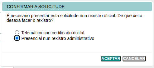 Al confirmar te preguntará si quieres hacer la presentación de la documentación telemática (con certificado digital) o presencial (en registro general).