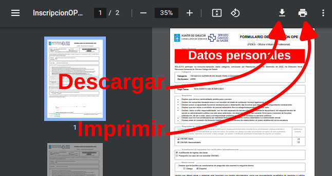 Si seleccionas la presentación presencial te aparecerá un mensaje confirmando que la solicitud se ha procesado y después se mostrará un documento PDF con el formulario para imprimir o descargar.