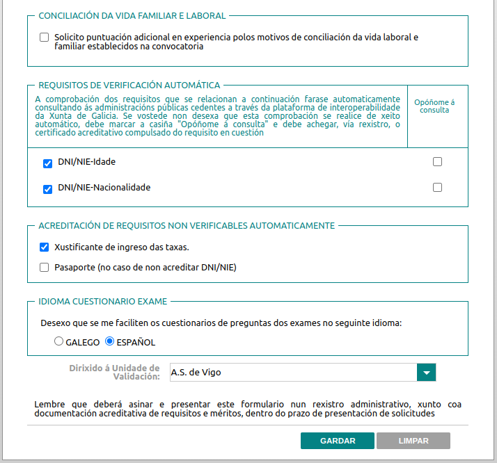 - REQUISITOS DE VERIFICACIÓN AUTOMÁTICA: si permites la verificación automática de tus datos (si marcas “Opóñome á consulta” tendrás que presentar los documentos en el registro).