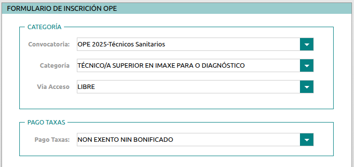- VÍA ACCESO: Libre (para la mayoría de participantes) o Discapacidade xeral (si tienes el grado de discapacidad acreditado)